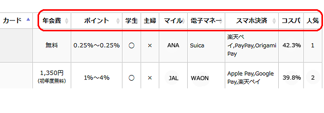 カードGALAでは各クレジットカードの主な情報をデータベース化、カードを一覧表示した時に並び替えて探しやすくなっています。